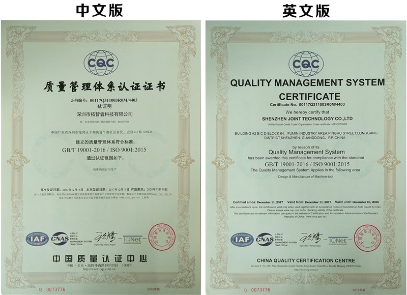 深圳市拓智者科技有限公司順利通過(guò)GB/T19001-2016/ISO9001:2015版質(zhì)量管理體系認(rèn)證工作,并獲得中國(guó)質(zhì)量認(rèn)證中心于1211日頒發(fā)的《質(zhì)量管理體系認(rèn)證證書(shū)》,為捷甬達(dá)品牌機(jī)床的生產(chǎn)和銷售提供了前提保障。