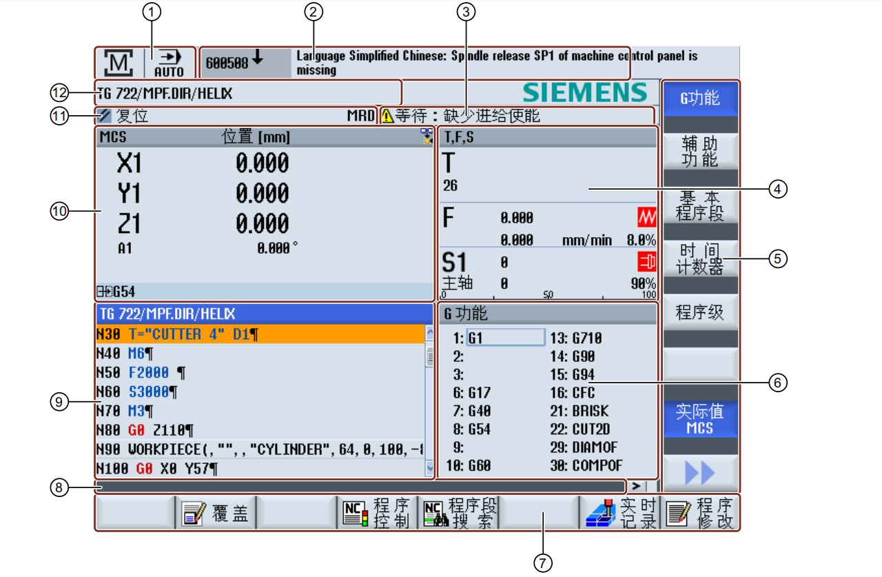 6 顯示 有效 G 功能,所有 G 功能,輔助功能,以及用于不同功能的輸入窗口(例如跳轉(zhuǎn)程序段,程序
