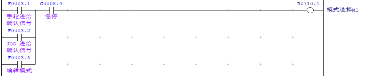伺服刀庫(kù)手動(dòng)模式下,“模式選擇-M1”均為“1”,因此在可以將機(jī)床手動(dòng)模式狀態(tài)(手輪,JOG,編輯)并列輸出“模式選擇-M1”為“1”