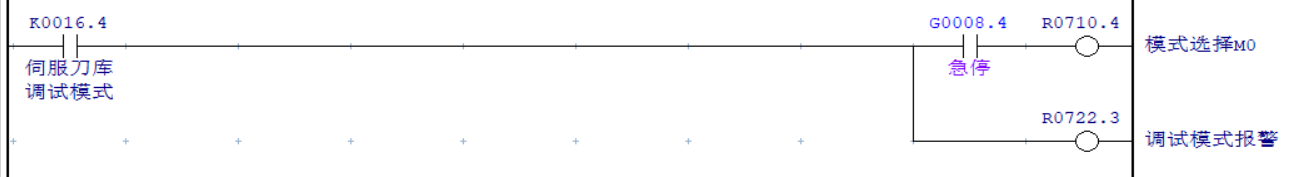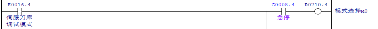 “模式選擇-M0”僅在刀庫(kù)寸動(dòng)模式為“1”,該模式一般用于伺服刀庫(kù)的原點(diǎn)設(shè)置,屬于調(diào)試模式,機(jī)床正常使用過(guò)程無(wú)需用到該功能,因此使用K參數(shù)切換“0或1”的輸出。K參數(shù)開啟后,機(jī)床處于手動(dòng)模式狀態(tài)(“模式選擇-M1”為“1”),即可激活伺服刀庫(kù)寸動(dòng)模式。且進(jìn)入該模式后刀庫(kù)處于調(diào)試模式,無(wú)法正常使用,同時(shí)需輸出刀庫(kù)處于調(diào)試模式的報(bào)警提示信息。