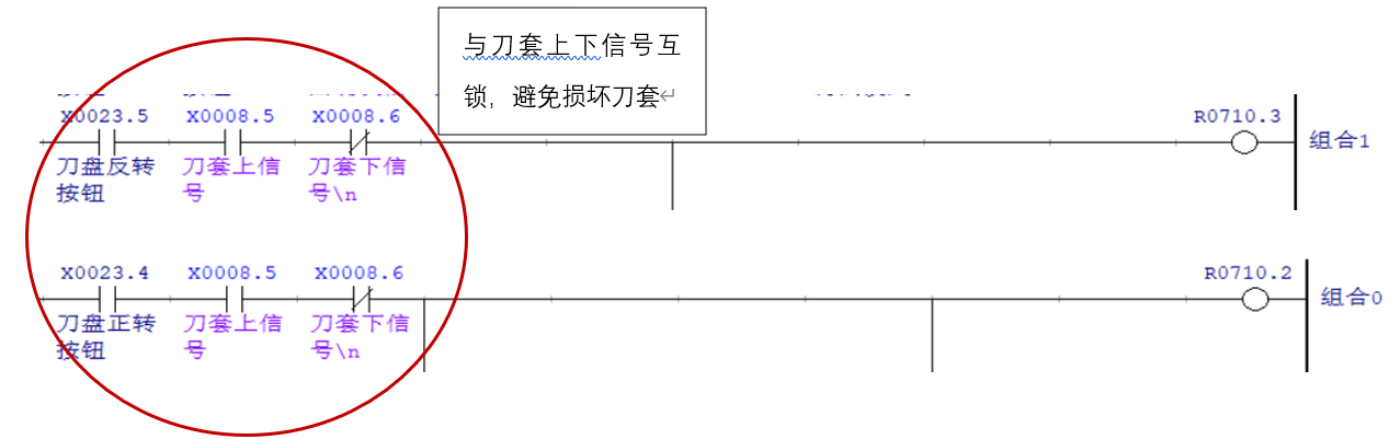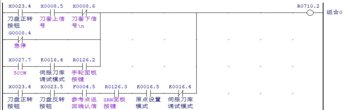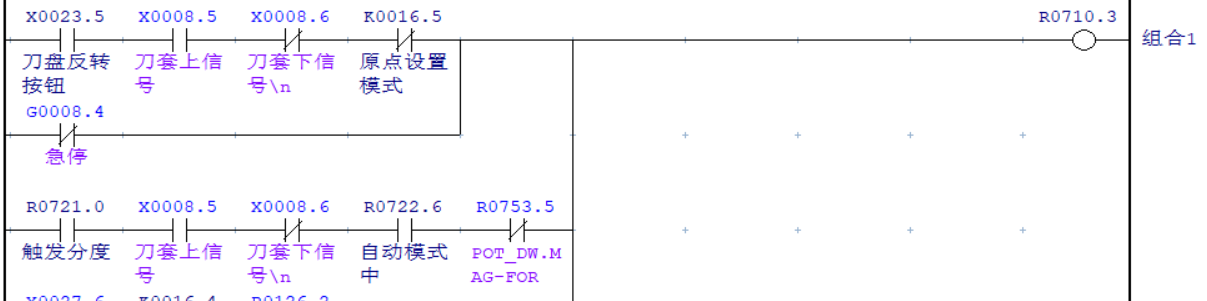 在 “模式選擇-M1”均為“1” “模式選擇-M0”均為“0”的狀態(tài)下,通過(guò)輸出“組合0”或“組合1”為“1”來(lái)試下刀盤的正反轉(zhuǎn),為避免在刀套打下的情況下轉(zhuǎn)動(dòng)刀盤導(dǎo)致刀庫(kù)損壞需同時(shí)與刀套上下信號(hào)做互鎖處理。