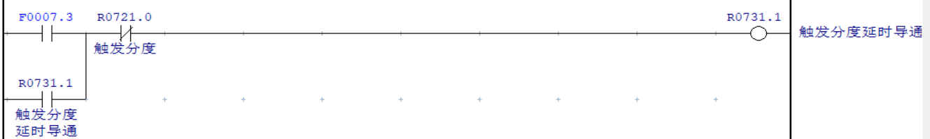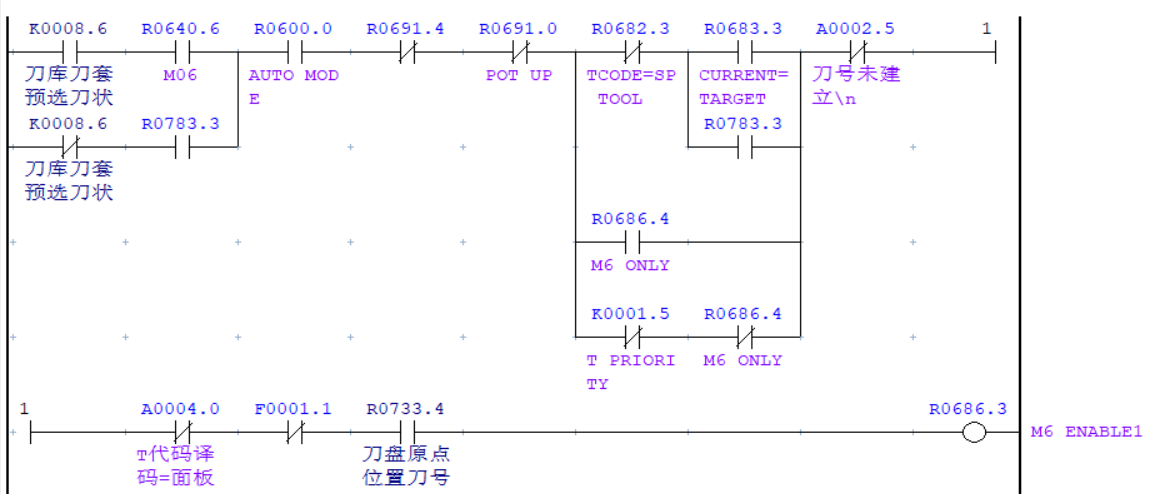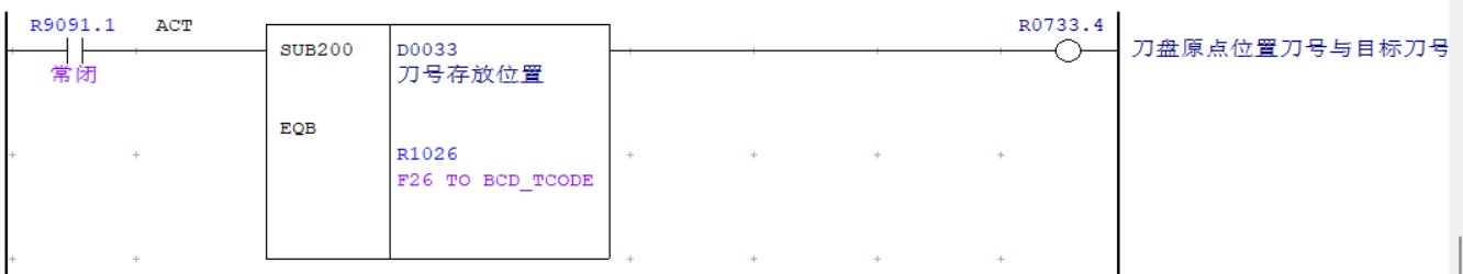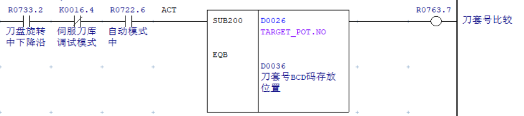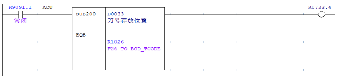 由于“自動(dòng)分度模式”需在伺服驅(qū)動(dòng)器在收到系統(tǒng)賦予的刀號(hào)后才能進(jìn)行尋刀切該模式需觸發(fā)0.2秒以上才能進(jìn)入,因此不能直接使用F7.3選刀信號(hào)進(jìn)行觸發(fā)而使用中間繼電器,且延遲0.2秒導(dǎo)通并進(jìn)行互鎖,確?!白詣?dòng)分度模式”可以正常觸發(fā)。刀盤選刀完成后導(dǎo)通SUB200功能指令進(jìn)行刀盤換刀位置刀套內(nèi)刀號(hào)與目標(biāo)刀號(hào)的比較,一致時(shí)輸出R733.4信號(hào)打斷“自動(dòng)分度模式” 互鎖,完成整個(gè)選刀過(guò)程。