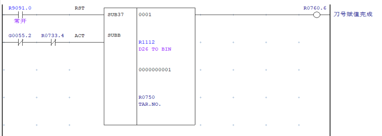 注:由于該款驅(qū)動(dòng)器CMD DI 組合(CMD1-CMD1均為0)即輸入0時(shí)為1號(hào)刀,而且系統(tǒng)默認(rèn)輸入1時(shí)為1號(hào)刀,因此使用SUB37(二進(jìn)制減法)功能模塊進(jìn)行刀號(hào)賦值傳輸。