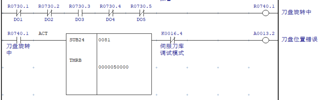 若刀盤旋轉(zhuǎn)選刀完成后刀盤位置錯(cuò)誤,即出現(xiàn)DO狀態(tài)中僅DO3為“1”,其它均為0,情況下需輸出報(bào)警提示。一般情況下手動(dòng)旋轉(zhuǎn)刀盤即可回正。若依然位置錯(cuò)誤,使用寸動(dòng)模式調(diào)整刀盤位置并重設(shè)原點(diǎn)也可解決。由于伺服刀庫(kù)進(jìn)行選刀時(shí),刀盤旋轉(zhuǎn)過(guò)程中也會(huì)伺服DO狀態(tài)中僅DO3為“1”,其它均為0的情況,因此該報(bào)警需延遲觸發(fā)。